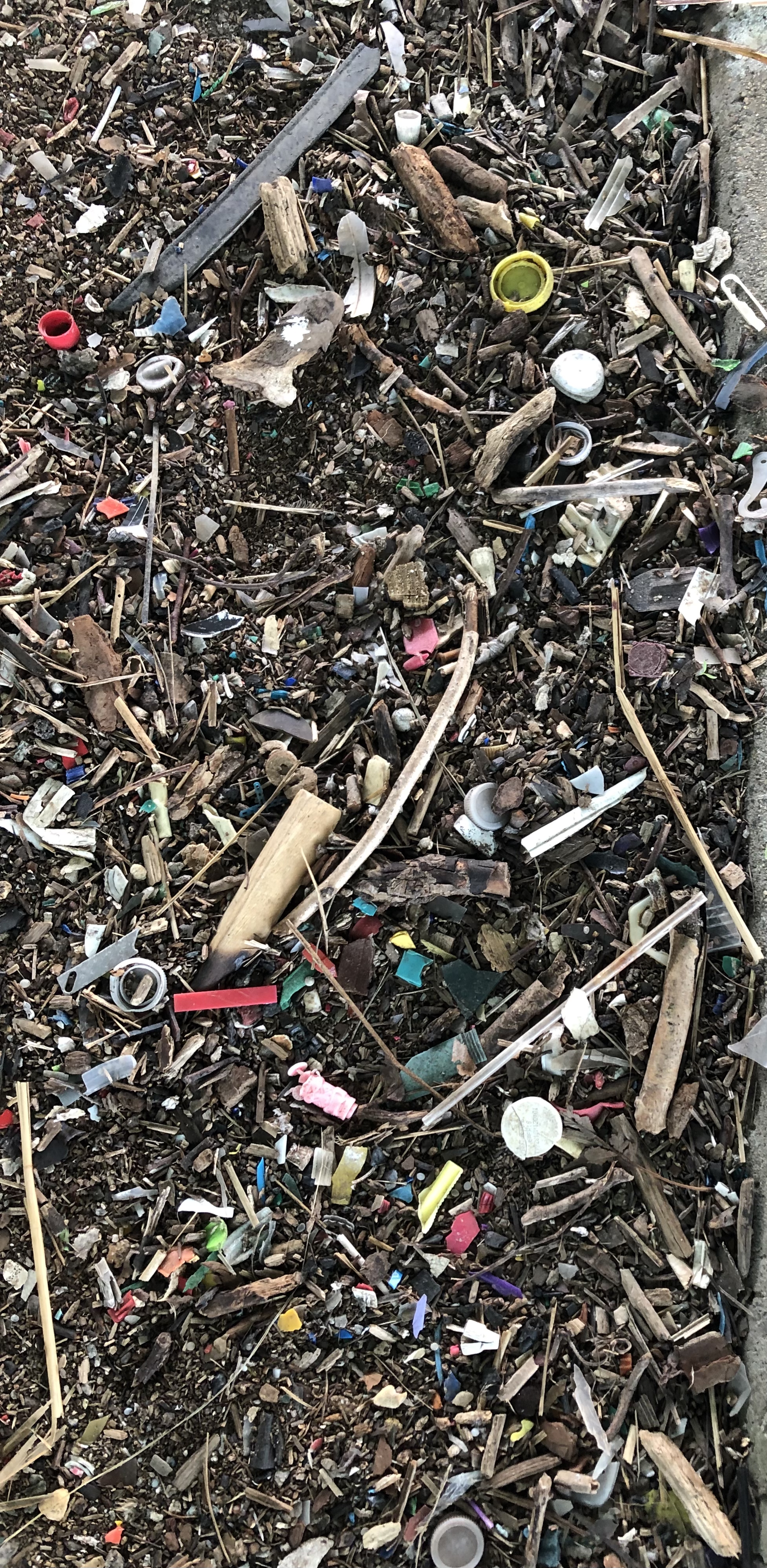 images: The Narragansett Bay watershed, including the Providence River, as captured by satellite (left); and an assortment of beached plastics seen at Collier Point Park in Providence (right).